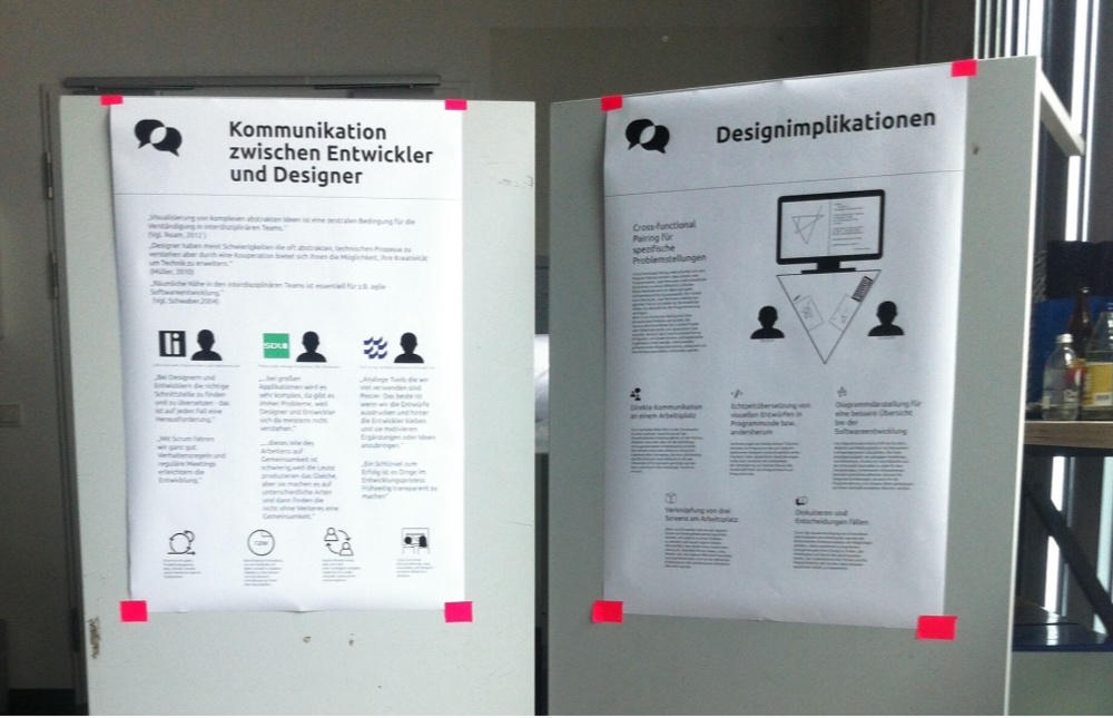 In order to get an idea of where people work and what surrounds them, e.g. which pictures are to be seen on the walls, I had chosen the method of Ethnographic Field Studies. Here you meet the people and study their natural environment. For my project, it was useful to know what it looks like and what objects they surround themselves with every day. I found out that the distances from one office to another are quite long and this could prevent a quick arrangement. With this method it was possible for me to see the world of designers and developers and to better understand their thoughts about their working environment.